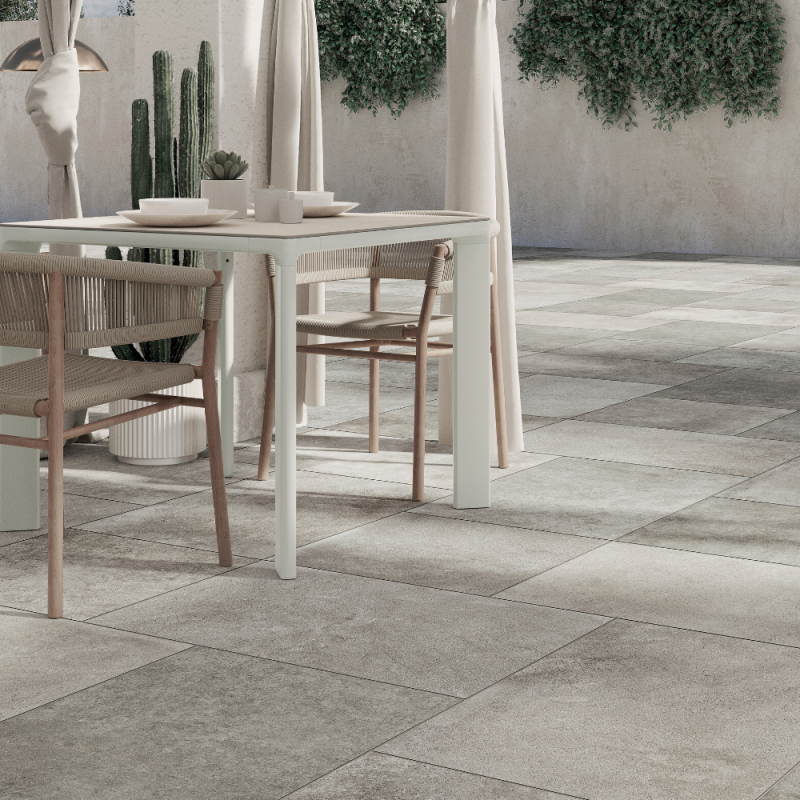 Eine robuste und pflegeleichte Outdoor-Fliese Mirage Feinsteinzeug ist ein kompaktes, widerstandsfähiges und nicht poröses Material, das es undurchlässig für Flecken, Säuren und äußere Einflüsse macht. Seine minimale Pflege und seine Haltbarkeit machen es zu einer idealen Lösung für moderne und elegante Terrassen.