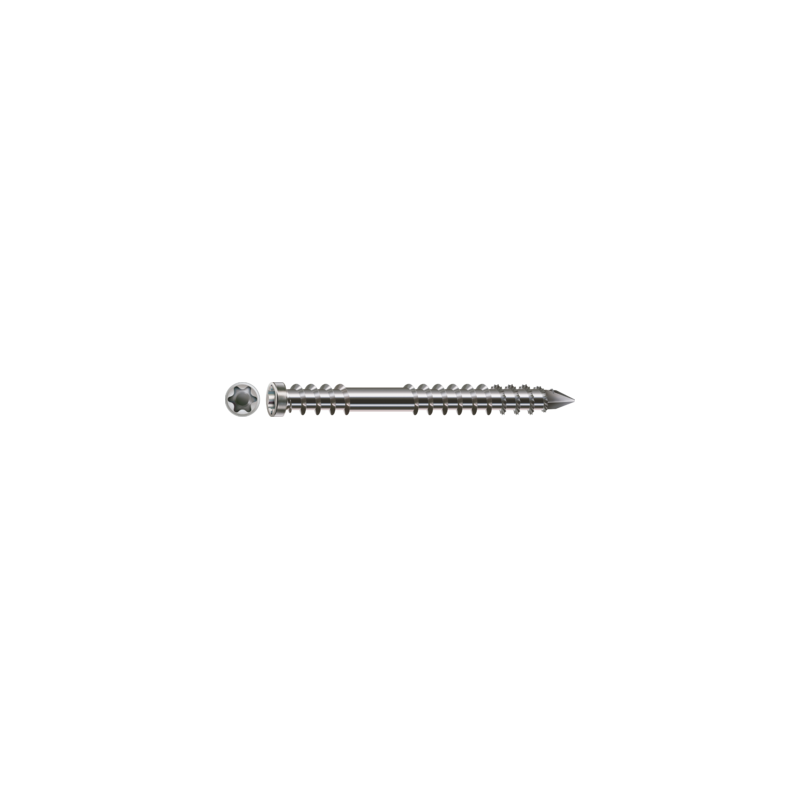 100 SPAX-Schrauben aus rostfreiem Edelstahl A4 für eine optimale Korrosionsbeständigkeit, die höher ist als die von Edelstahl A2. Diese leistungsstarken Schrauben werden daher für den Bau von Terrassen am Meer oder in der Nähe von Swimmingpools empfohlen.