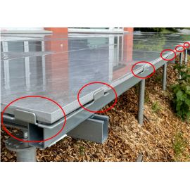 Der 120 mm breite Verbinder wird am C-Profil befestigt und ermöglicht eine weitgehend verstellbare Positionierung der Fliese und damit einen hohen Verlegekomfort. Der Connect Stone C+ ist mit einem Seitenanschlag versehen. Er wird am Rand der Terrasse angebracht und verhindert, dass die Fliese nach der Montage seitlich verrutscht. Er dient außerdem als Stütze für den vertikalen Abschluss aus Blech.