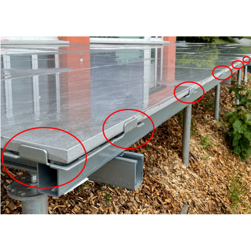 This 120mm side connector should be attached to the C-profile. It allows you to wide adjust the positioning of the tile in several ways, ensuring an easy installation. The ConnectStone C+ is equipped with a lateral stopper that is placed on the periphery of the terrace, preventing the tile from sliding laterally after installation. It also serves as a support for the vertical finishing with sheet metal.