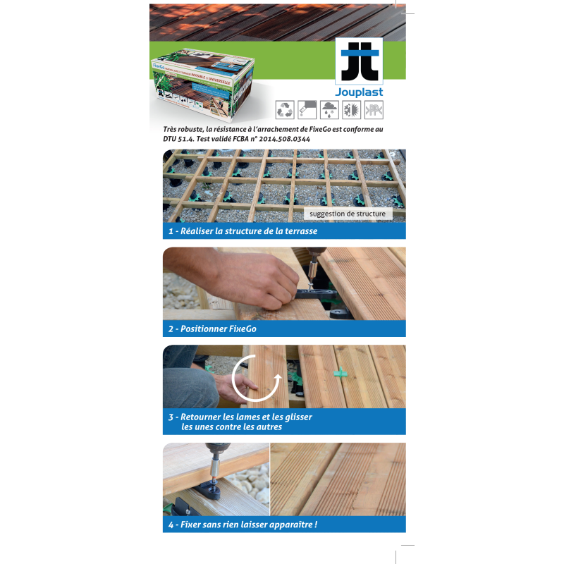 Setting up the FIXEGO is simple and does not require any additional tools: accessible to all, its handling is easy and offers a quality result. Adaptable to all types of wooden boards, its use is possible regardless of the essence of your wooden deck covering. This fixing system is compatible with installation on a joist pedestal. Instructions and warnings regarding the use of concealed deck fasteners: