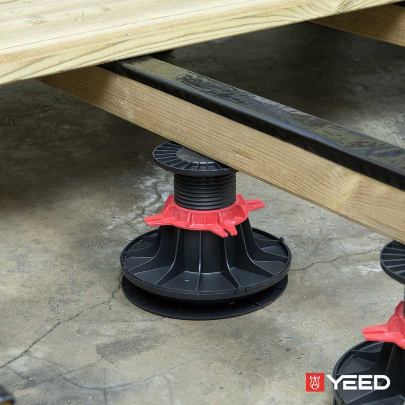 YEED 115/175 mm joist self-leveling pedestal. Serves as a foundation for laying a wooden or composite deck. The height is adjusted using the adjustment ring from 115 to 175 mm. Thus, you will obtain a raised terrace allowing the passage of cables and pipes. Quick and easy installation: direct to the ground without fixing, can be done in just 3 days. Load supported: more than one ton. 10 year warranty. Made in France.