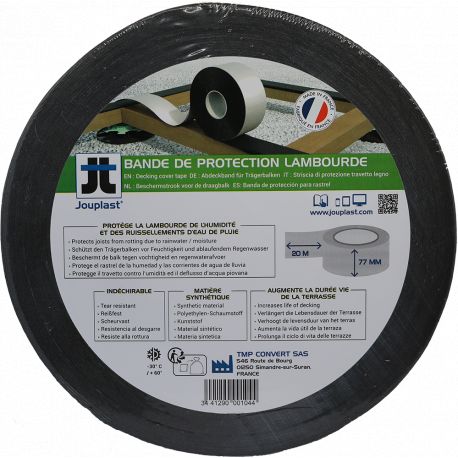 Cinta autoadhesiva de proteccion para pegar sobre rastreles del recubrimiento constituyente de la estructura de la terraza. Protege los rastreles de la humedad y del agua de lluvia. Aumenta la duracion de la terraza. Resistente a la rotura, agentes atmosfericos y UV. Adhiera a la madera, hormigon y metal. Asegura el sellado de la estructura. Compatible Jouplast. Bobina de 20 m, anchor de 8 cm.
