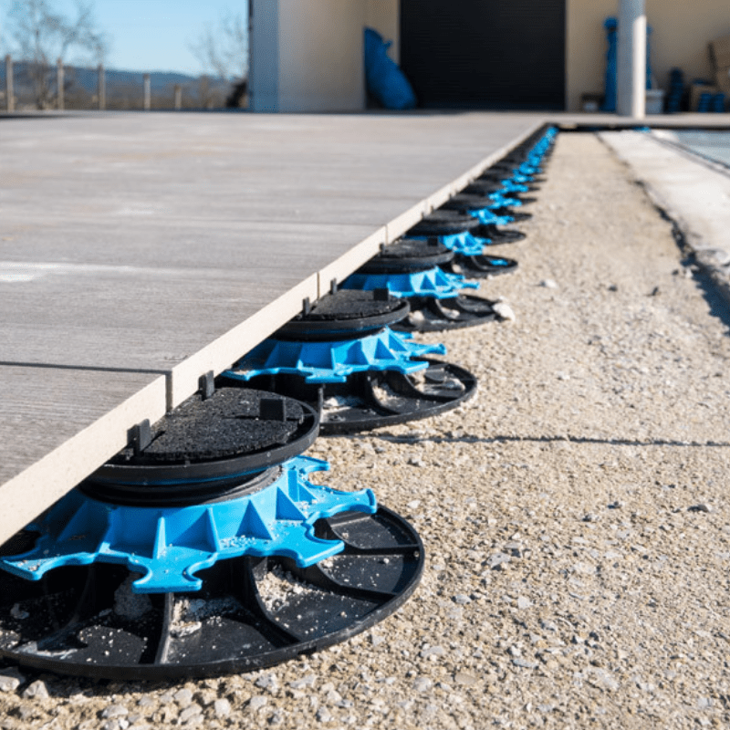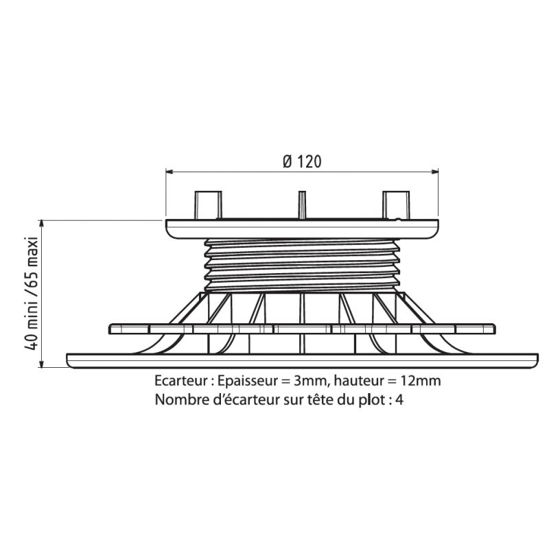 Base de montaje ajustable 40/65 mm para losas. Altura ajustable de 40 a 65 mm. Marca: Jouplast. Materiales totalmente reciclables (resina sintetica: polipropileno cargado). Las bases de montaje son conformes a los DTU 43.1 y 51.4. Resistente a cargas superiores a 1 tonelada, a las soluciones acidas y basicas pero tambien a las condiciones atmosfericas. Fabricacion francesa.