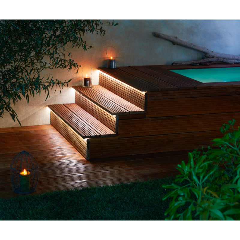 - Escalier extérieur en bois : poser puis fixer les lambourdes et visser les lames de bois sur les lambourdes. Respecter un espacement de 3 à 5 mm entre les lames de bois.