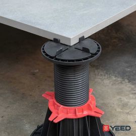 La mise en place est très simple : la cale amortisseur se pose sur la tête du plot en laissant dépasser des découpes les ergots présents à cet endroit. Déposez ensuite vos dalles de carrelage et le tour est joué, nul besoin quelconque fixation !