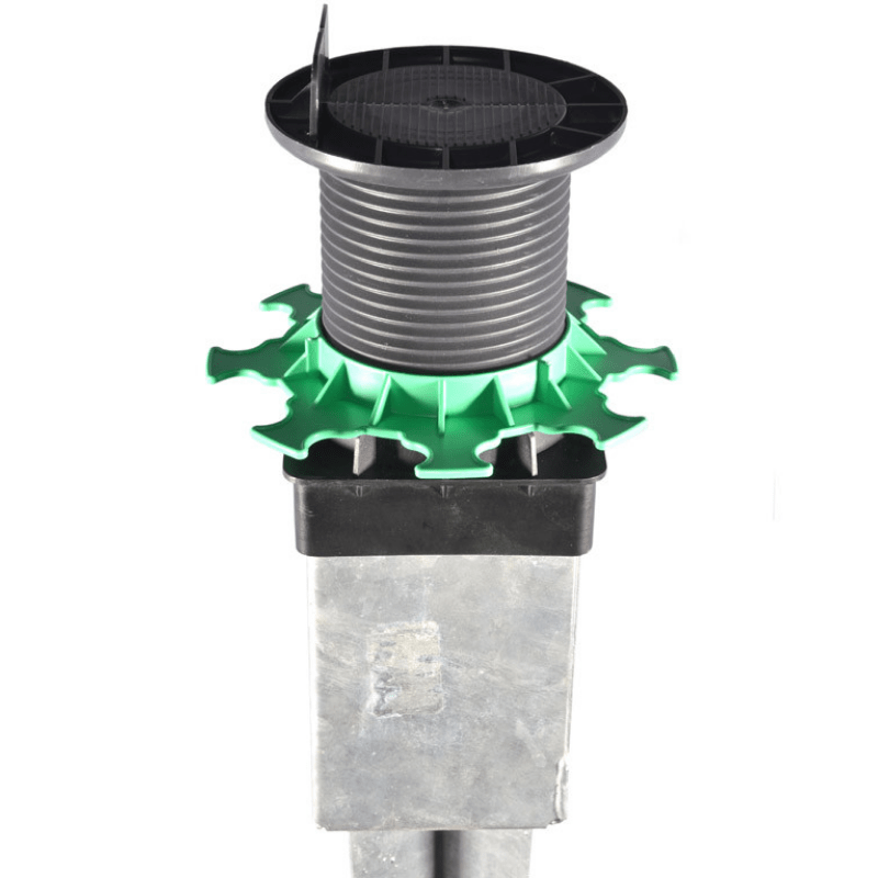 Il piedino regolabile Elevo è un supporto per travi in legno o metallo da posizionare su un palo metallico interrato, ideale per la costruzione di terrazze in legno. Il piedino Elevo di Jouplast è regolabile in altezza da 43 mm a 138 mm, con una gamma di regolazione di 95 mm. Composto da una base specifica per palo 90x90 mm e da una testa progettata per fissare la trave, il piedino Elevo permette un’installazione diretta senza scavi né preparazione del terreno.