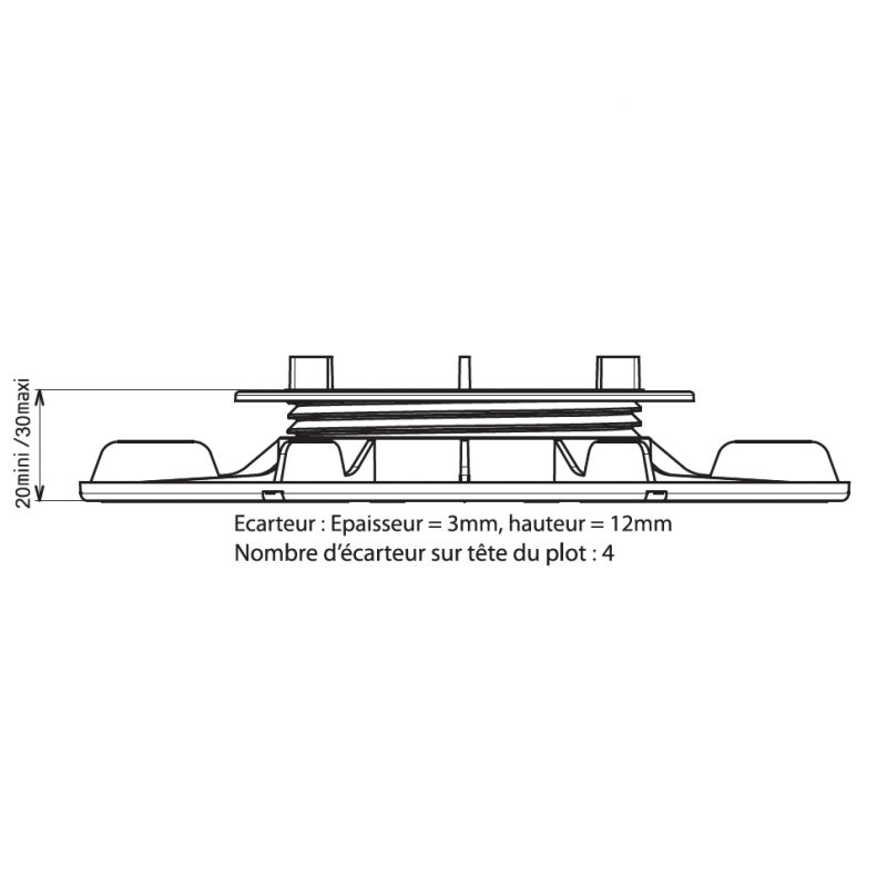 Altezza regolabile da 20 a 30 mm per ovviare alle differenze di livello e stabilizzare la vostra installazione. Da posizionare ad ogni angolo della piastrella ed eventualmente al centro per un sostegno ulteriore. Tutti i distanziatori sulla testa del piede sono secabili per ottenere una testa liscia (per un eventuale posa al centro della piastrella). E' possibile aggiungere un piede al centro della piastrella.